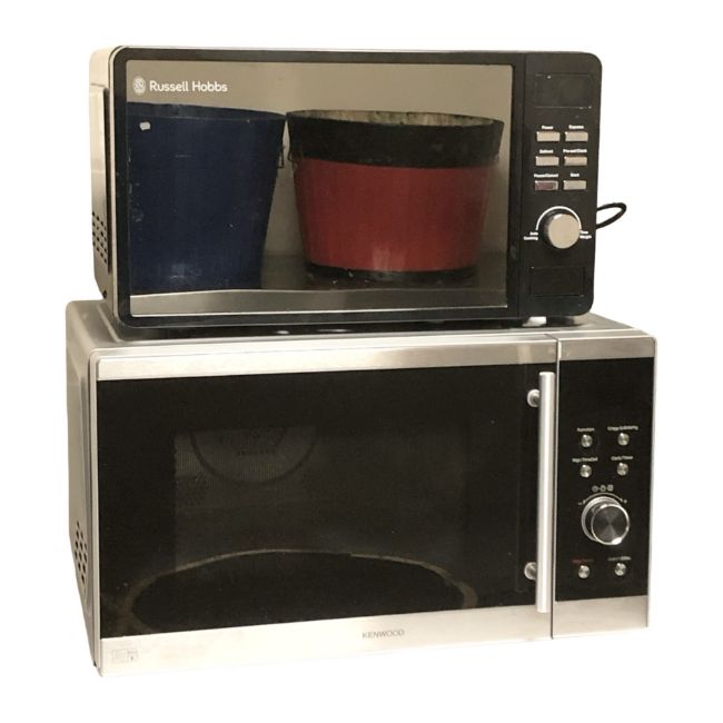 A Kenwood microwave and a Russell Hobbs microwave.