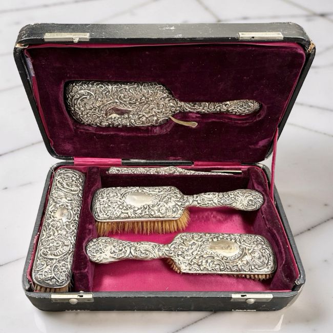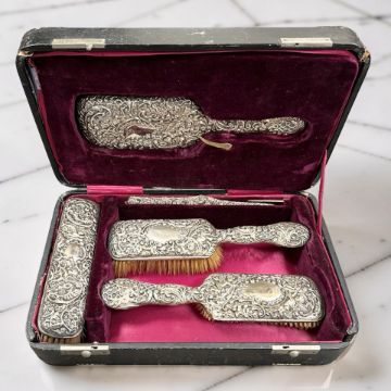 A Victorian silver-backed five piece dressing table set, Birmingham 1897, longest piece 25cm, cased.