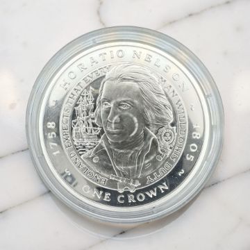 A 2006 Falkland Islands silver crown commemorating Lord Nelson, weight 28.28 g, in capsule.