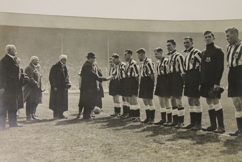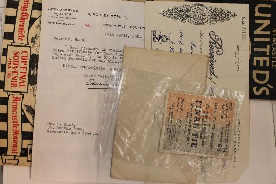 A specially commissioned album relating to the Newcastle and Arsenal F.A. cup final 1932, including large photographs, team photograph and additional images from 1912 to 1934 as well as the late Victorian and Edwardian era. Also included in the lot a signed photograph of Newcastle captain Bill Mc Cracken, a copy of Newcastle United articles association, related ephemera to the 1950's cup finals and Fair's cup 1969 and a 1951 cup final ticket.