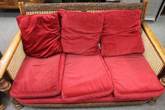 An early twentieth century carved oak bergere three piece lounge suite. (3) CONDITION REPORT: Good condition. Missing back leg.