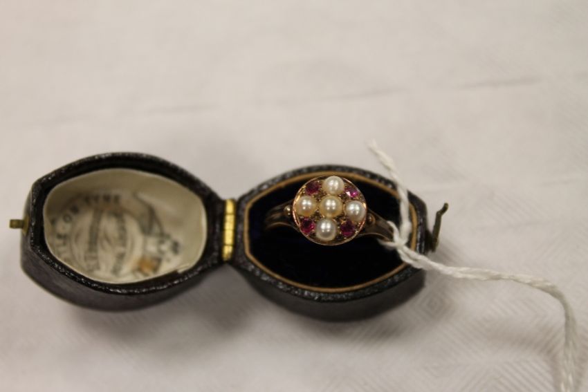 An 18ct gold seed pearl and ruby cluster ring. CONDITION REPORT: Good time aged condition.