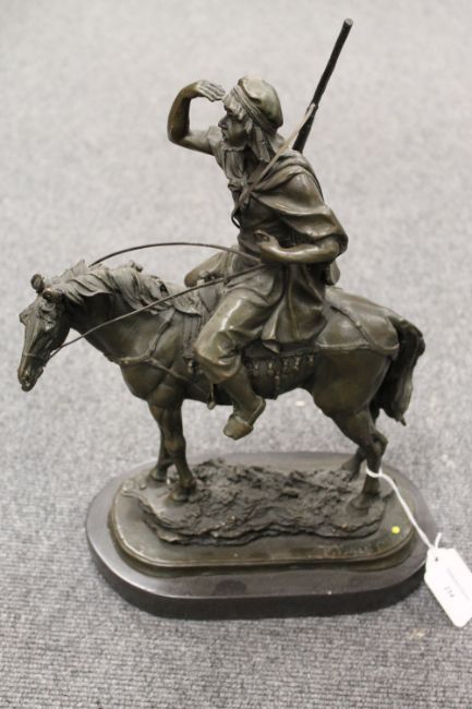 After Paillet - bronze study of an Arab on horse back, on marble plinth, height 36 cm.