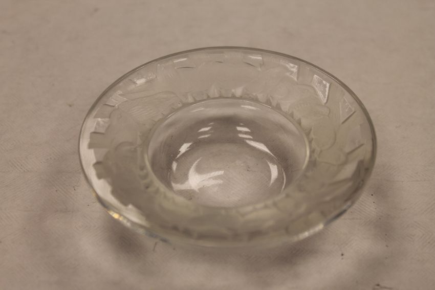 A lalique glass dish with etched decoration depicting birds, diameter 9.2 cm. CONDITION REPORT: Good condition.