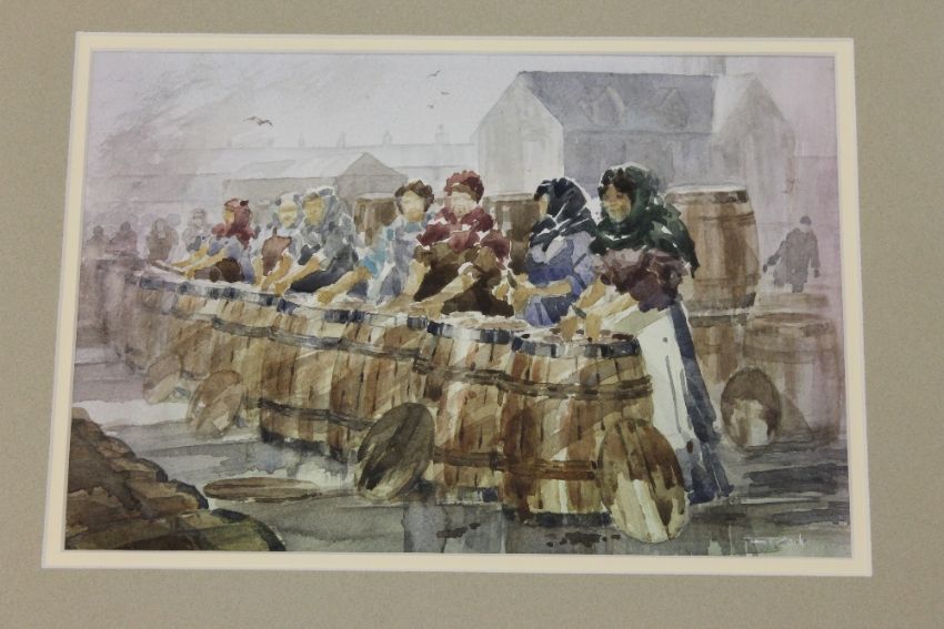 Tom Dack : Cutting and packing herring, watercolour, signed, 20 cm x 29 cm, framed.