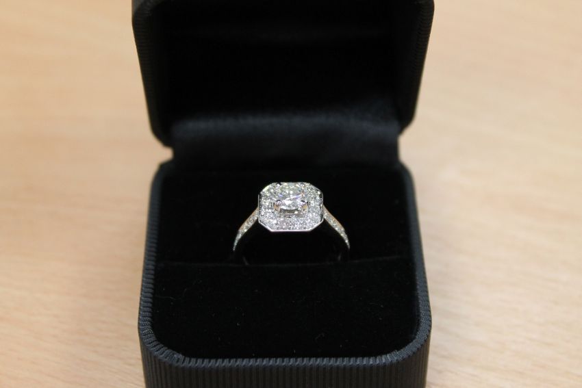 An 18ct white gold diamond cluster ring, approximately 1.1ct, colour G, with diamond shoulders.