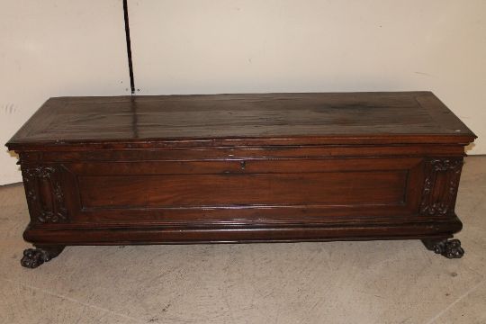 A seventeenth century Italian cassone, on paw front feet, width 180 cm.