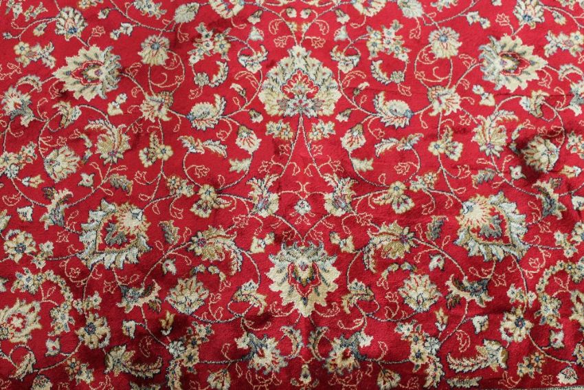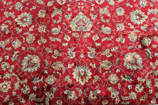 A Kashmir fringed rug with vine design on red ground, 2259 cm x 158 cm.