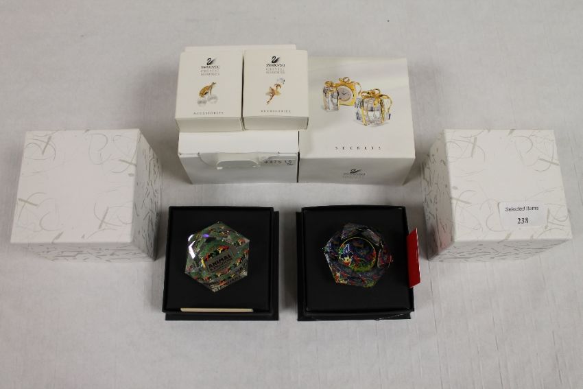 Two Swarovski crystal Arribas collection paperweights, together with three Crystal Memories accessories and alarm clock with teddy bear, all parts boxed. (6)