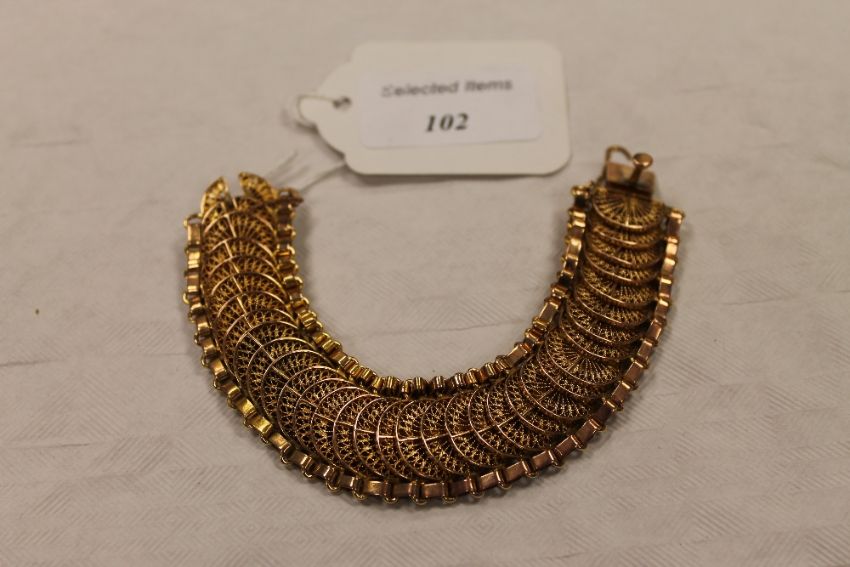 A yellow metal flexi-link bracelet with fan shaped filigree centres, 49g. CONDITION REPORT: Good condition, unmarked.