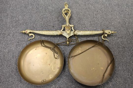An early twentieth century brass balance, with fish decoration and fitted weights, height 86.5 cm. CONDITION REPORT: Good condition.