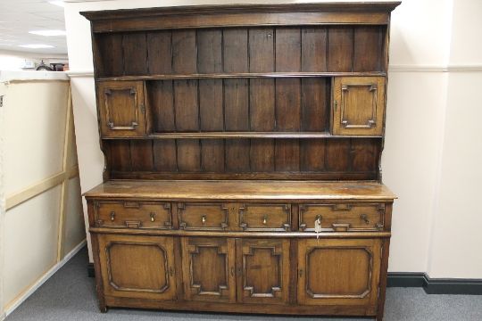 A Georgian style oak dresser with delft rack, width 190 cm.