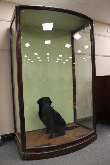 A Victorian mahogany bow fronted museum display cabinet by Samuel Elliott & Sons, 122 cm x 197 cm x 78 cm.