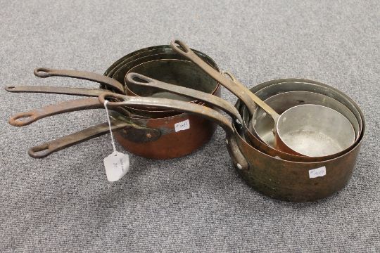 Eight French copper saucepans. (8) CONDITION REPORT: Mostly good / fair condition, some rubbing and general knocks.
