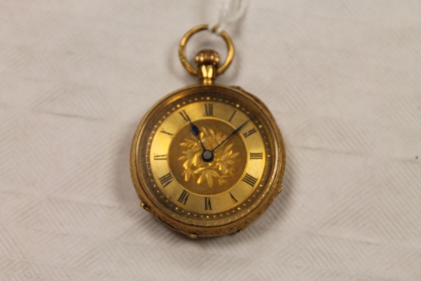 An 18ct gold fob watch. CONDITION REPORT: Good condition, requires some cleaning, 26.9g gross weight, with import marks 18 '.75'.