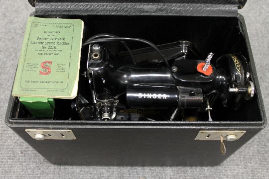 A Singer portable sewing machine model 221K, in original case with accessory kit. CONDITION REPORT: Good time aged original condition.