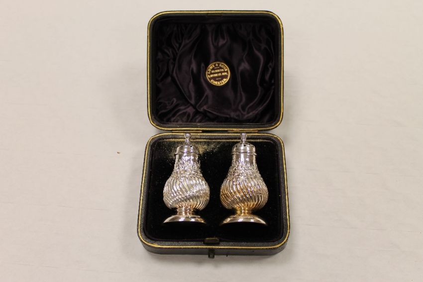 A pair of silver pepper pots, Birmingham 1891, cased. CONDITION REPORT: Good condition.