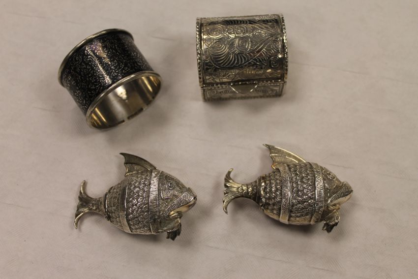 A pair of continental white metal salts modelled as fish, together with a niello napkin ring and miniature white metal casket indistinctly signed. (4) CONDITION REPORT: Good condition.