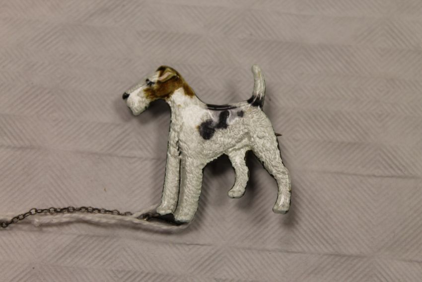 A sterling silver and enamel brooch modelled as a fox terrier, width 3.5 cm. CONDITION REPORT: Good condition, on safety chain.