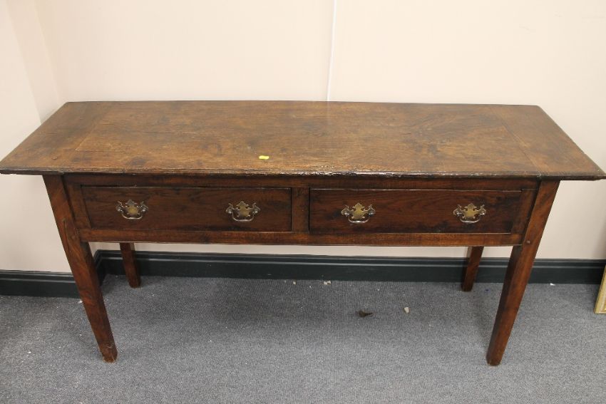 An early nineteenth century two drawer side table, on square tapered legs, width 154 cm. CONDITION REPORT: Good condition, with later handles. Good colour and patination to the top.