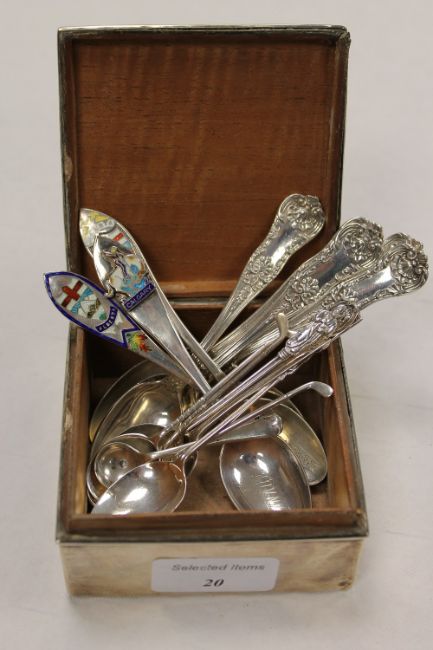 A silver cigarette box, together with fifteen small spoons. (16) CONDITION REPORT: Fair condition, the square box lined, some surface knocks. The spoons mainly teaspoons, three tourist pieces, one small condiment spoon.