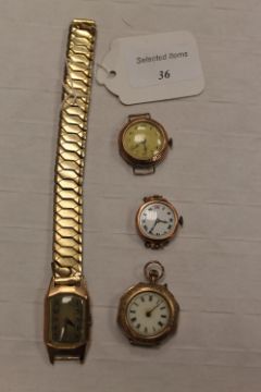 A 9ct gold gentleman's wrist watch, together with a 9ct gold fob watch and two watches. (4) CONDITION REPORT: All items for restorations.