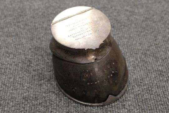A silver mounted pony hoof ink well, London 1908. CONDITION REPORT: Good condition, with inscription to hinged lid, some time aged holes to front of hoof.