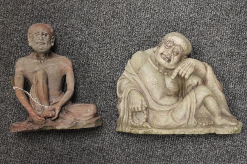 A Chinese carved stone figure depicting an elderly Gentleman, toegther with a similar carving depicting a man holding his foot. 21 cm. (2) CONDITION REPORT: Both figures in good condition, figure of the man holding his foot is believed to missing a toe.
