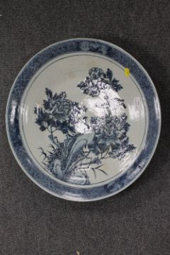 A late nineteenth century Chinese plaque - decorated with birds in foliage, diametre 46.5 cm. CONDITION REPORT: Double circle to base, time aged crazing with some discolouration