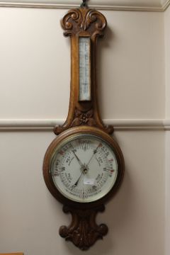 A late Victorian carved oak aneroid barometer.