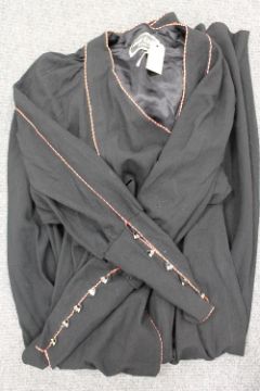 A vintage Bill Gibb black evening coat with red and white piped trim.