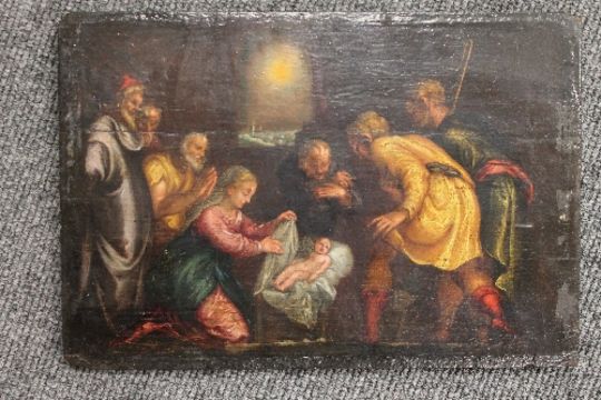 Nineteenth century school : Nativity scene, oil on panel, un-framed, 27.5cm x 19 cm. CONDITION REPORT: Requires cleaning, time aged wear.