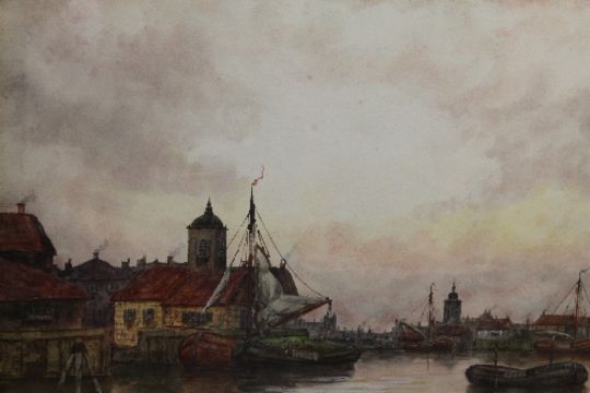 J. Van Couver : Vlaardiugen, Holland, watercolour, signed, 35cm x 52cm, together with the companion piece 'On the Maas, Holland', both parts framed. (2)