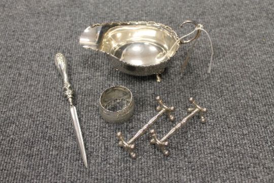 A silver sauce boat, London 1913, together with a silver napkin ring, a pair of silver knife rests and a silver mounted letter opener. (5) CONDITION REPORT: Good time aged condition.