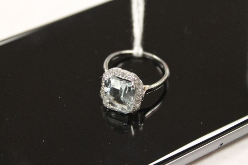 An aqua marine and diamond ring. CONDITION REPORT: Unmarked but in white gold.