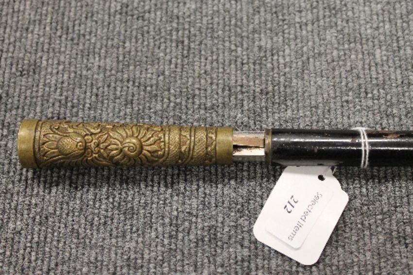 A late Victorian sword stick with brass embossed terminal. CONDITION REPORT: Good time aged condition. The main stem constructed of black metal with some minor scuffs and paint missing.