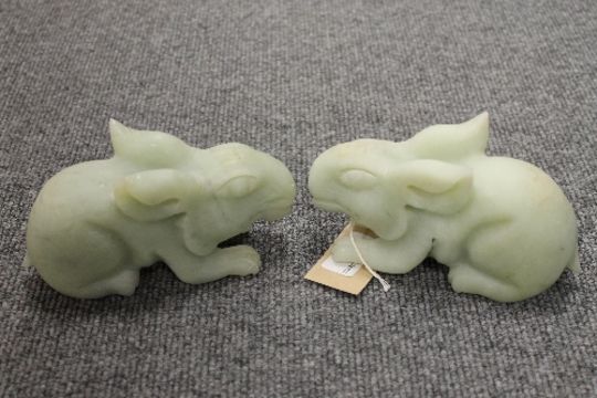 A pair of Chinese carved green stone rabbits, height 8.5 cm. (2) CONDITION REPORT: Good condition, thought to be twentieth century, some light surface scuffs.