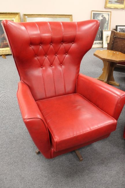 A mid twentieth century red vinyl three piece lounge suite together with a square footstool. (4)