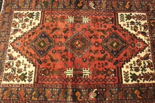 An Iranian wool rug, on red ground, 138 cm x 94 cm.