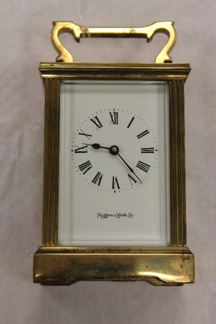 A Mappin & Webb brass carriage clock, height 11.5 cm. CONDITION REPORT: Good condition, minor wear to the case and tarnishing.