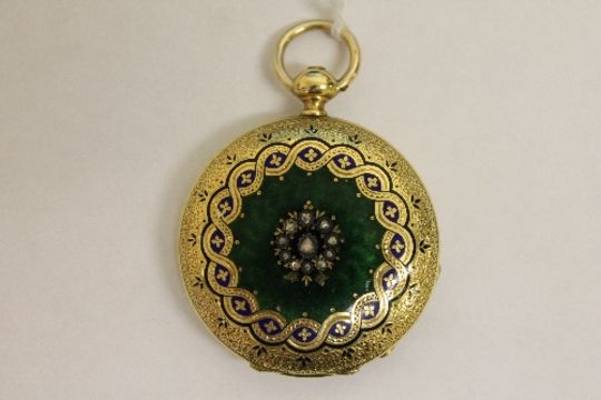 An 18ct gold fob watch set with diamonds in coloured enamel, decoration to both outer cases. CONDITION REPORT: Good condition, super quality case, missing the glass lens.