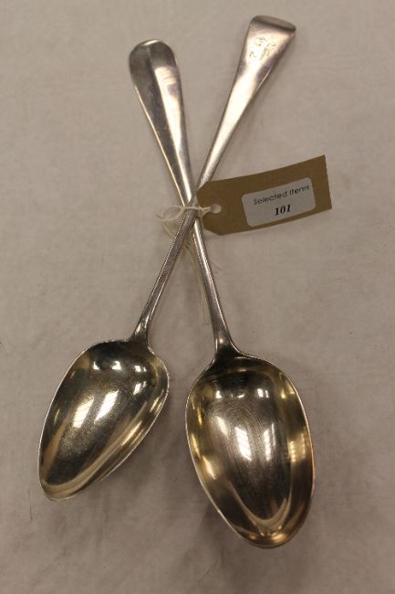 Two silver basting spoons. (2) CONDITION REPORT: Good condition, nineteenth century and early twentieth century dates.