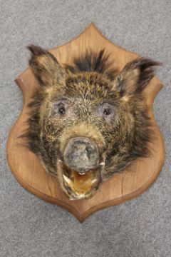 A taxidermy boar's head, on oak shield, width 52 cm. CONDITION REPORT: Good condition.