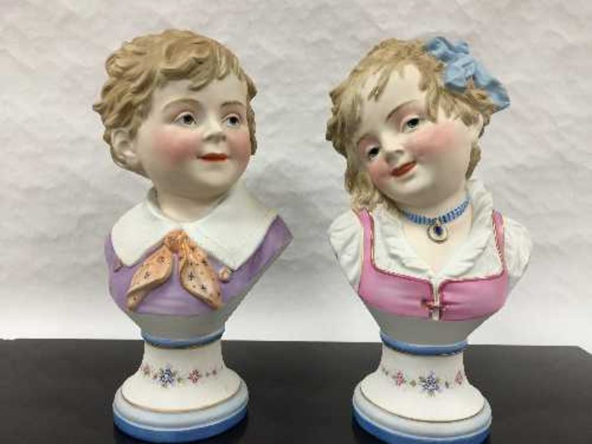 A pair of German porcelain busts, Richard Eckert and Co, circa 1900, modelled as a girl and boy in traditional dress, height 28cm.