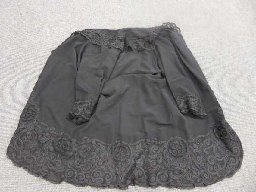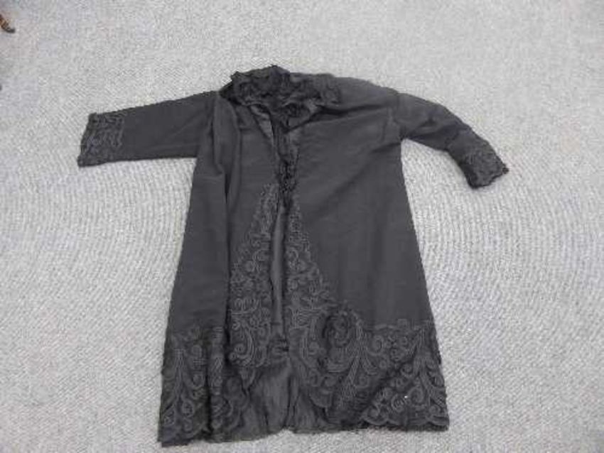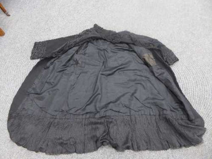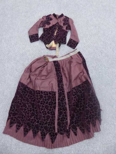 A collection of vintage clothing to include a Victorian two piece lady's dress embossed with Burgundy velvet, a black lace gown of the same era, two lady's jackets a more contemporary violet leather dress.