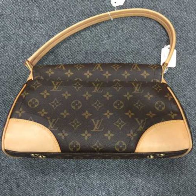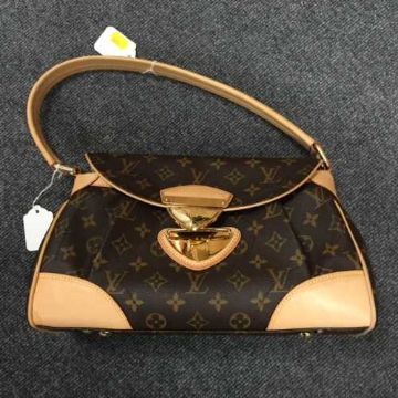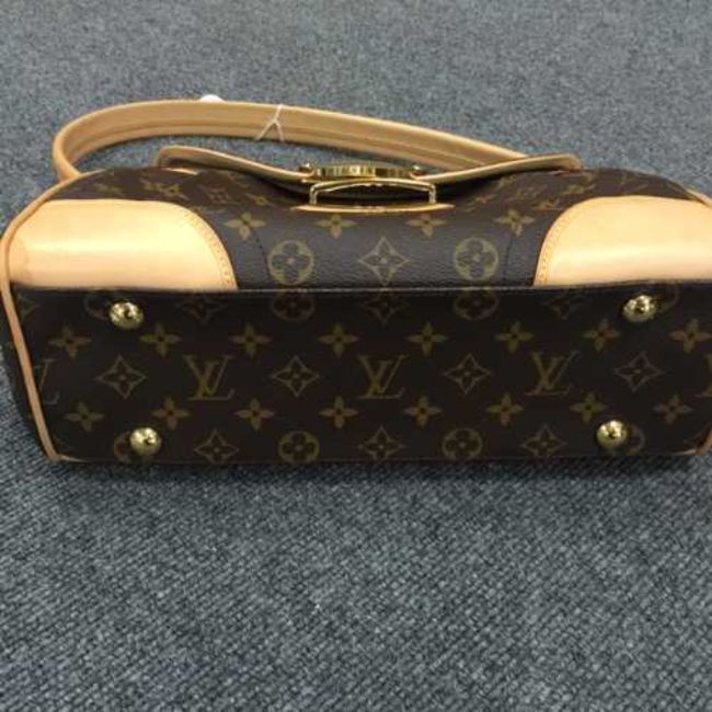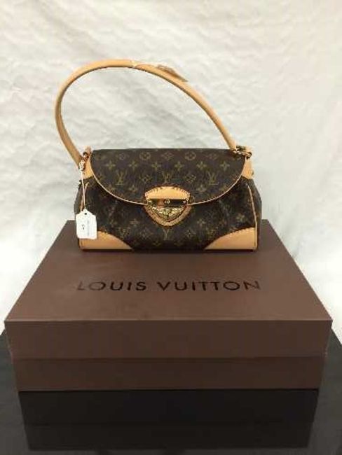 Louis Vuitton : A lady's Beverly hand bag, monogram canvas with tan trim, flap top secured with push lock closure, with carry handle, with shoulder strap, width at widest point 33 cm, with blank Louis Vuitton gift tag on leather string, in a Louis Vuitton protective cloth sack, in a Louis Vuitton brown card box' in a Louis Vuitton carrier bag.