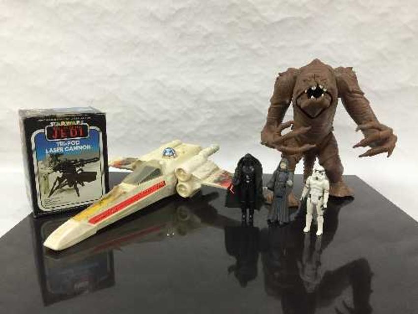 A large quantity of boxed and unboxed Star Wars models and figurines, to include; Large qty of figures (100+) from the franchise, unboxed and in various conditions, an All Terrain Armoured Vehicle, Hoth Wampa, Rebel Armoured Snow Speeder, Rancor Monster, Radar Laser Cannon, Ewok Assault Catapult, B-Wing Fighter, Rebel Transport, Imperial Shuttle, Millenium Falcon, Ewok Combat Glider, Jabba the Hut, Tripod Laser Cannon, INT-4 Interceptor, Vehicle Maintenance Energizer, Endor Forest Ranger, Scout Walker, Sy Snootles and the Rebo Band, Y-Wing Fighter, CAP-2 Captivator etc.(Q) CONDITION REPORT: Most boxes tatty/torn and generally in poor condition. Figures and models in various condition. Viewing is advised.