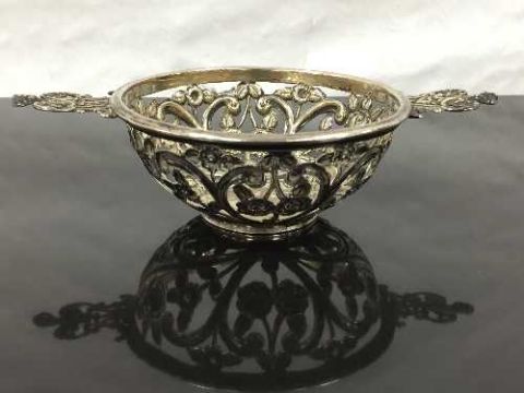 A silver quaich, Birmingham 1887, makers mark 'GNRH', with pierced floral decoration to body and handles, 14cm diameter, 62.2g. CONDITION REPORT: Lacking liner, hallmarks slightly rubbed, typical tarnishing, otherwise good.