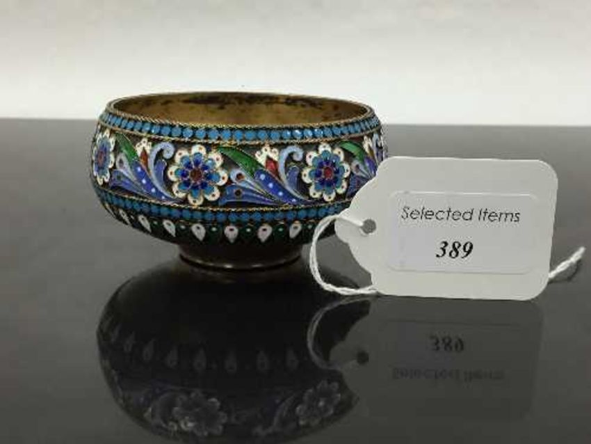 A late nineteenth century Russian .875 silver and cloisonne enamel salt, bears Moscow St. George hallmark, assayer Lev Fridrikhovitch Oleks (Moscow 1880's/90's), width 9cm. CONDITION REPORT: Silver with typical tarnishing, hallmarks crisp, enamel in good order. 88g.