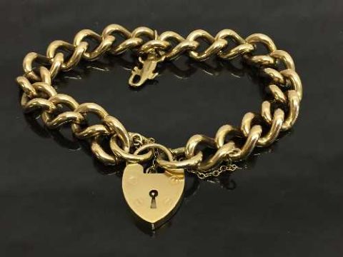 A 9ct gold bracelet upon which hangs a 9ct gold crocodile charm, with padlock, 60.6g.